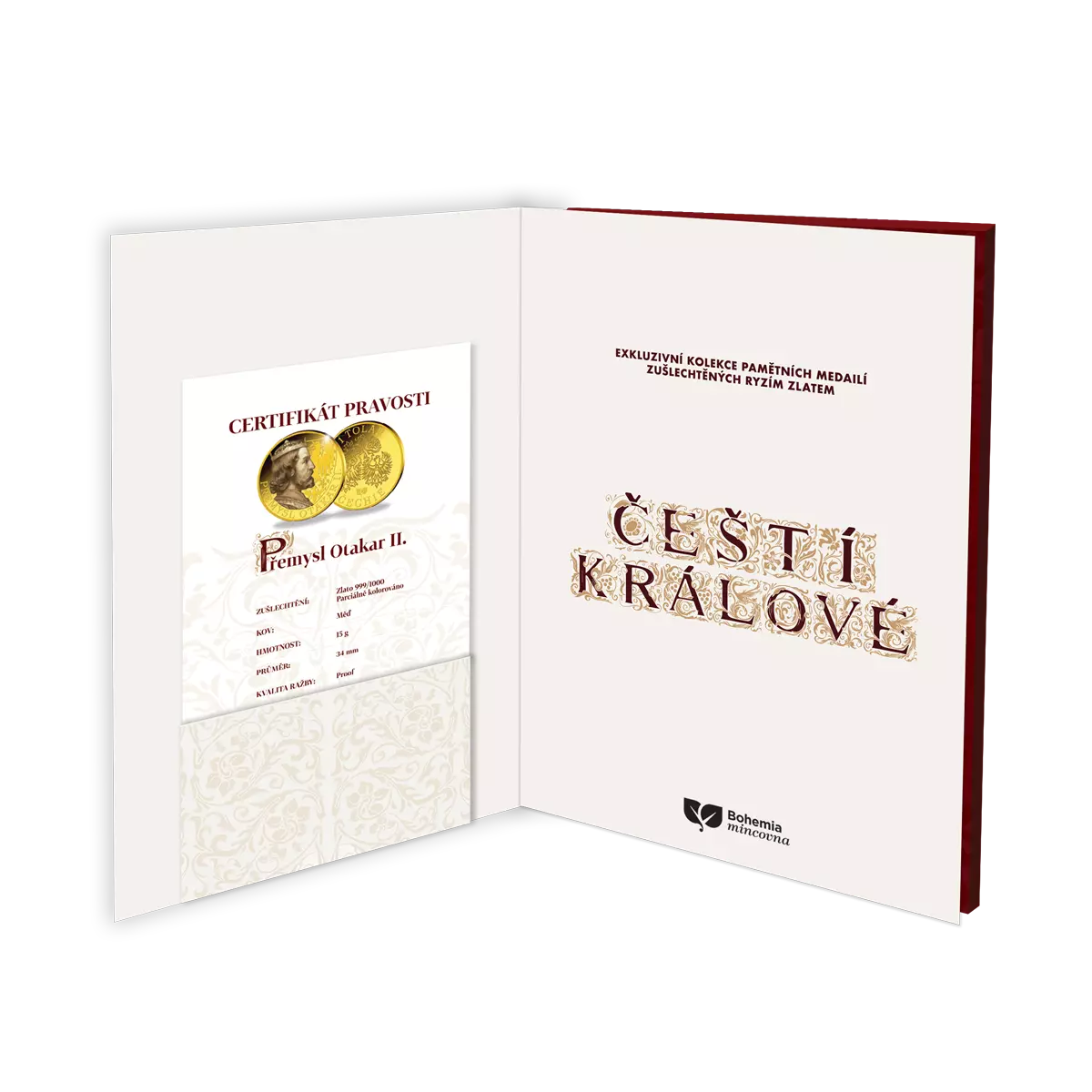 Pamětní ražba Přemysl Otakar II. otevírá exkluzivní kolekci Čeští králové. Objednáním pamětní ražby Přemysl Otakar II. si otevíráte fascinující kolekci Čeští králové. Další pamětní ražby z kolekce obdržíte cca v měsíčním intervalu každou za cenu 999 Kč + 129 Kč poštovné a balné. Kolekce nyní obsahuje 24 kusů ražeb, může se ale v budoucnu rozšiřovat. Více informací o kolekci najdete zde. Podmínky objednávky si můžete přečíst zde.