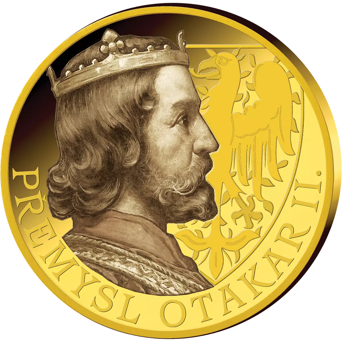 Pamětní ražba ražená v nejvyšší numismatické kvalitě a zušlechtěná ryzím zlatem na svém averzu nese portrét Přemysla Otakara II. vyvedený unikátní technikou kolorování v barvě sépie, která je zde použita v České republice zcela poprvé. Na pozadí je v reliéfu znázorněna plamenná orlice, rodový erb Přemyslovské dynastie.
