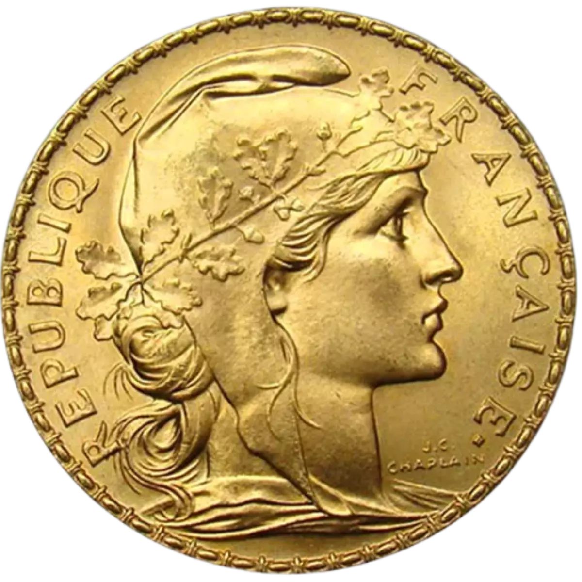 Tento autentický zlatý artefakt z let 1899–1914 patří k nejkrásnějším evropským ražbám přelomu století. Vyražen byl ze zlata vysoké ryzosti 900/1000 a nese silnou symboliku svobody, hrdosti a jednoty francouzského národa.