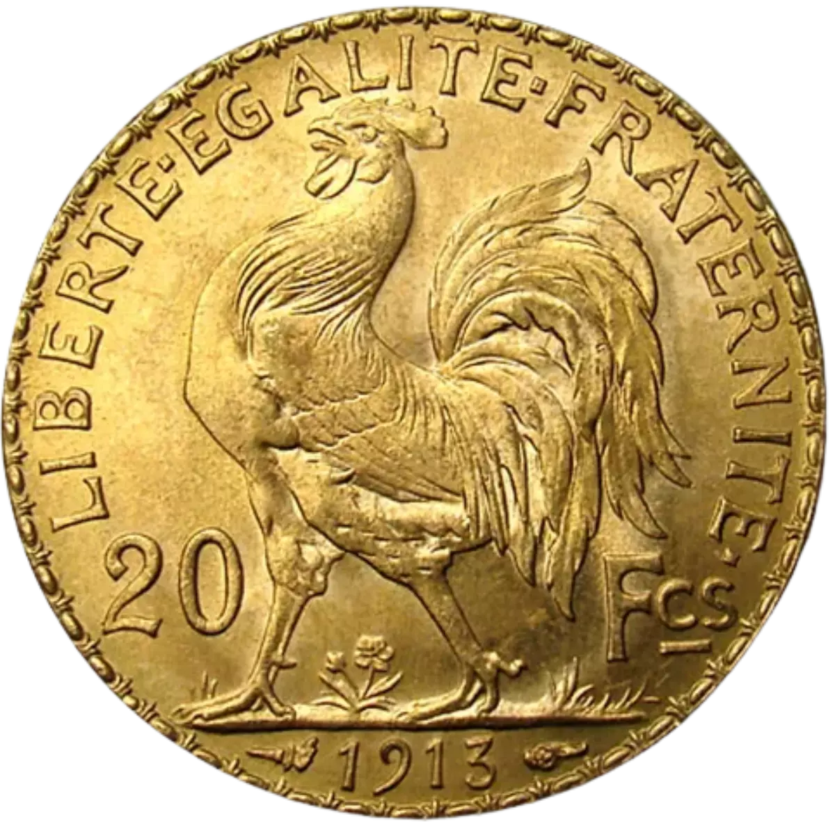 Na zlaté minci 20 franků se tyto dva symboly setkávají. Na jedné straně stojí Galský kohout – pyšný, vztyčený, připravený bojovat za ideály svobody. Na druhé Marianne – klidná, moudrá a neochvějná. Společně vyprávějí příběh Francie, která povstala z popela monarchie a zrodila republiku, jež svou sílu čerpá z hrdosti i lidství. Málokterá mince v dějinách nese tak hluboké poselství – odkaz odvahy, svobody a ducha národa vyražený do ryzího zlata.