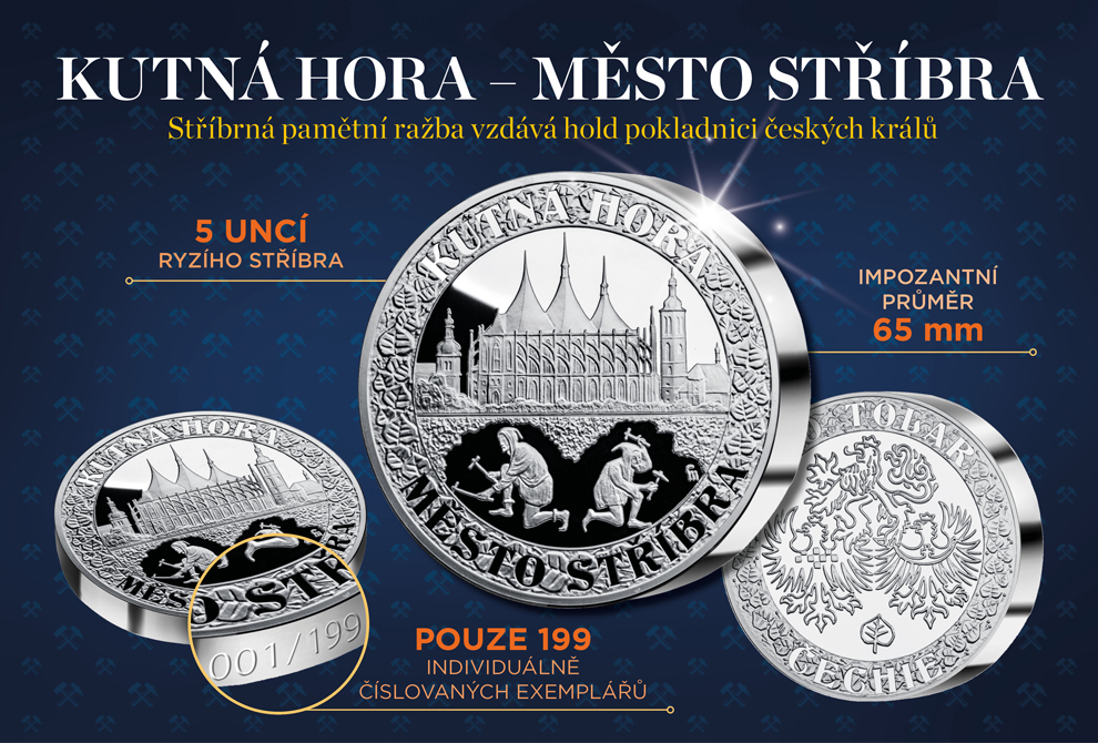 Pamětní ražba Kutná Hora – město stříbra je ražená v 5 uncích ryzího stříbra 999/1000 o impozantním průměru 65 mm v nejvyšší ražební kvalitě Proof. V horním plánu averzu ražby je zobrazena dominana města, velkolepý gotický pětilodní Chrám sv. Barbory, ve spodní části se pak odehrává středověká scéna těžby stříbra, jež vyneslo Kutné Hoře výsostné postavení a učinilo z ní svého času ekonomický pilíř země.