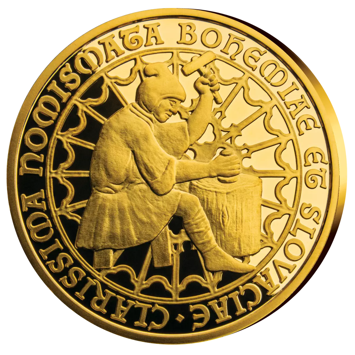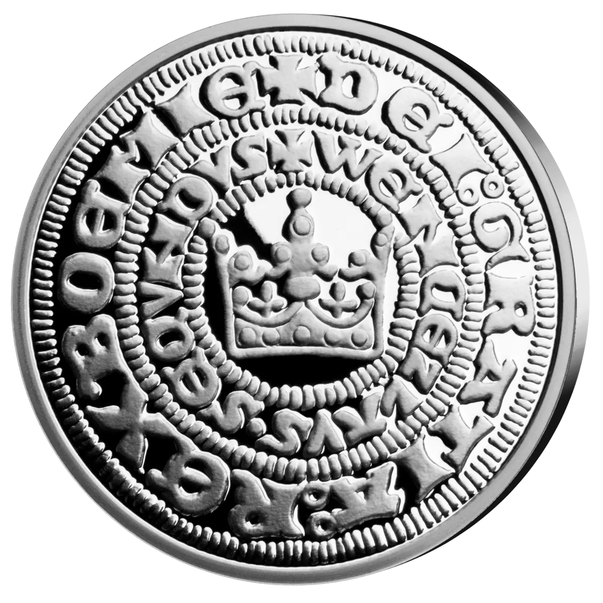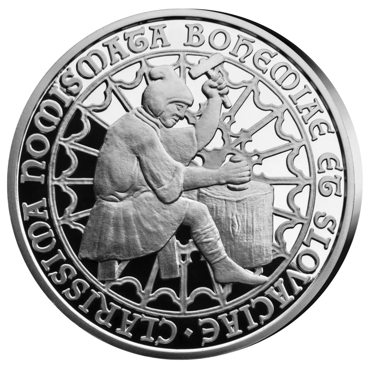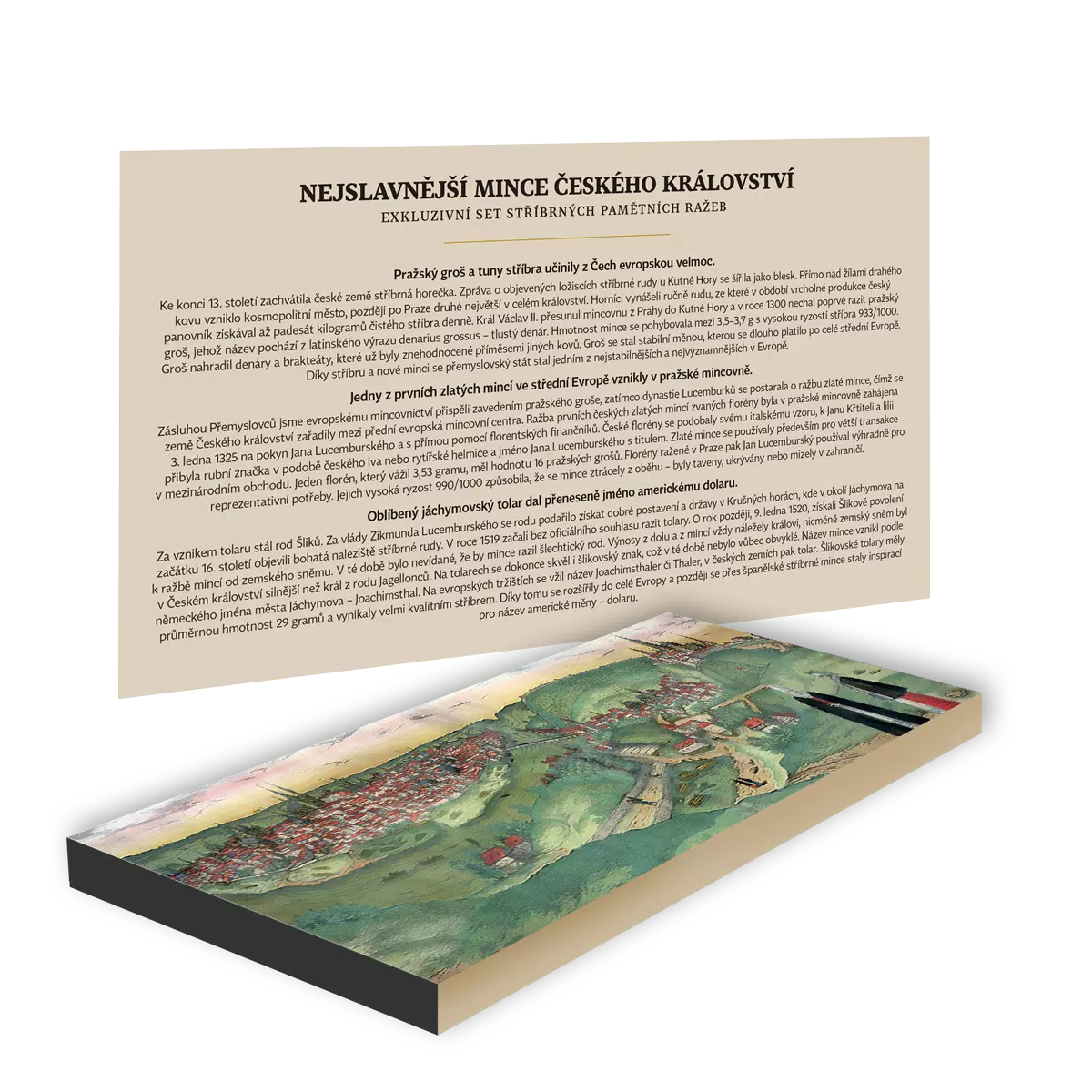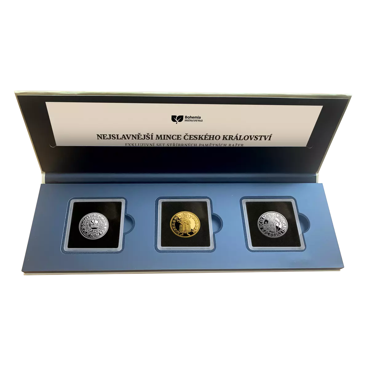 Tři mince se výrazně zapsaly do dějin evropské a potažmo i světové numismatiky – pražský groš, florén a jáchymovský tolar – nyní v mimořádném zpracování z ryzího stříbra 999/1000. Velkorysý průměr 30 mm v kombinaci s nejvyšší kvalitou proof dává naplno vyniknout každému detailu ražby – od jemných linií reliéfu až po dokonale zrcadlové plochy, které podtrhují mistrovské zpracování ražeb.