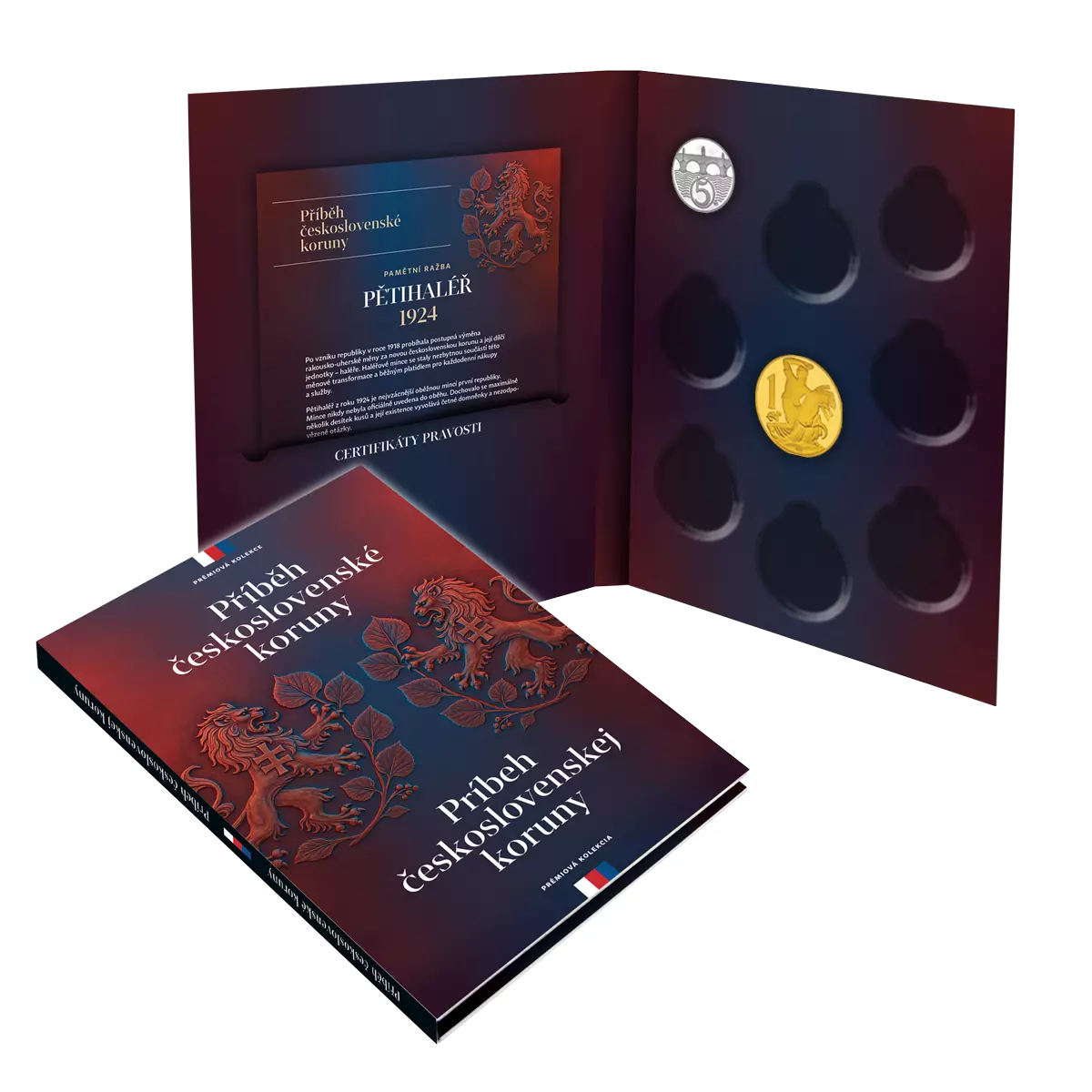 Unikátní kolekce Příběh československé koruny vypráví osud československé měny od počátku mladé republiky. Averz pamětní ražby věrně zobrazuje originál první československé koruny z roku 1922 od významného medailéra Otakara Španiela. Příběh československé koruny doplňují i další pamětní ražby významných mincí. Například jednokoruna Františka Jozefa I. z roku 1916, poslední stříbrná koruna habsburské monarchie, ražená v době jejího rozpadu nebo nejzáhadnější oběhová mince Pětihaléř z roku 1924. Důležitou roli sehrál také kolek Československé republiky, jednoduchá kolková známka, jejímž prostřednictvím se v roce 1919 oddělila stará měna od nové. Do zlomových okamžiků patří i protektorátní koruna z roku 1941, slovenská mince 1 Ks, či tříhaléř z roku 1953, který doprovodil dramatickou komunistickou měnovou reformu. Každá z těchto mincí představuje jinou etapu vývoje státu, politiky i ekonomiky.