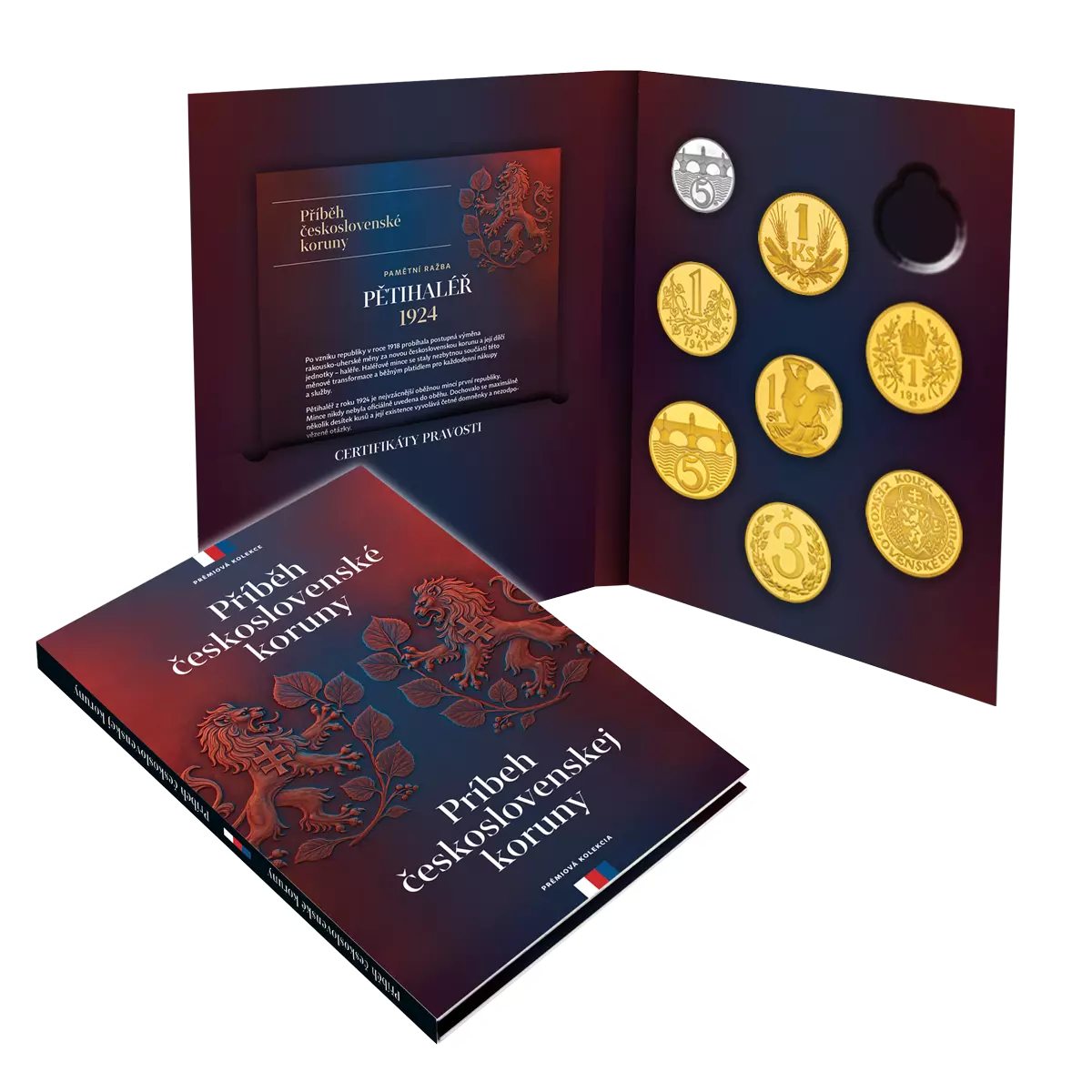 Unikátní kolekce Příběh československé koruny vypráví osud československé měny od počátku mladé republiky. Averz pamětní ražby věrně zobrazuje originál první československé koruny z roku 1922 od významného medailéra Otakara Španiela. Příběh československé koruny doplňují i další pamětní ražby významných mincí. Například jednokoruna Františka Jozefa I. z roku 1916, poslední stříbrná koruna habsburské monarchie, ražená v době jejího rozpadu nebo nejzáhadnější oběhová mince Pětihaléř z roku 1924. Důležitou roli sehrál také kolek Československé republiky, jednoduchá kolková známka, jejímž prostřednictvím se v roce 1919 oddělila stará měna od nové. Do zlomových okamžiků patří i protektorátní koruna z roku 1941, slovenská mince 1 Ks, či tříhaléř z roku 1953, který doprovodil dramatickou komunistickou měnovou reformu. Každá z těchto mincí představuje jinou etapu vývoje státu, politiky i ekonomiky.