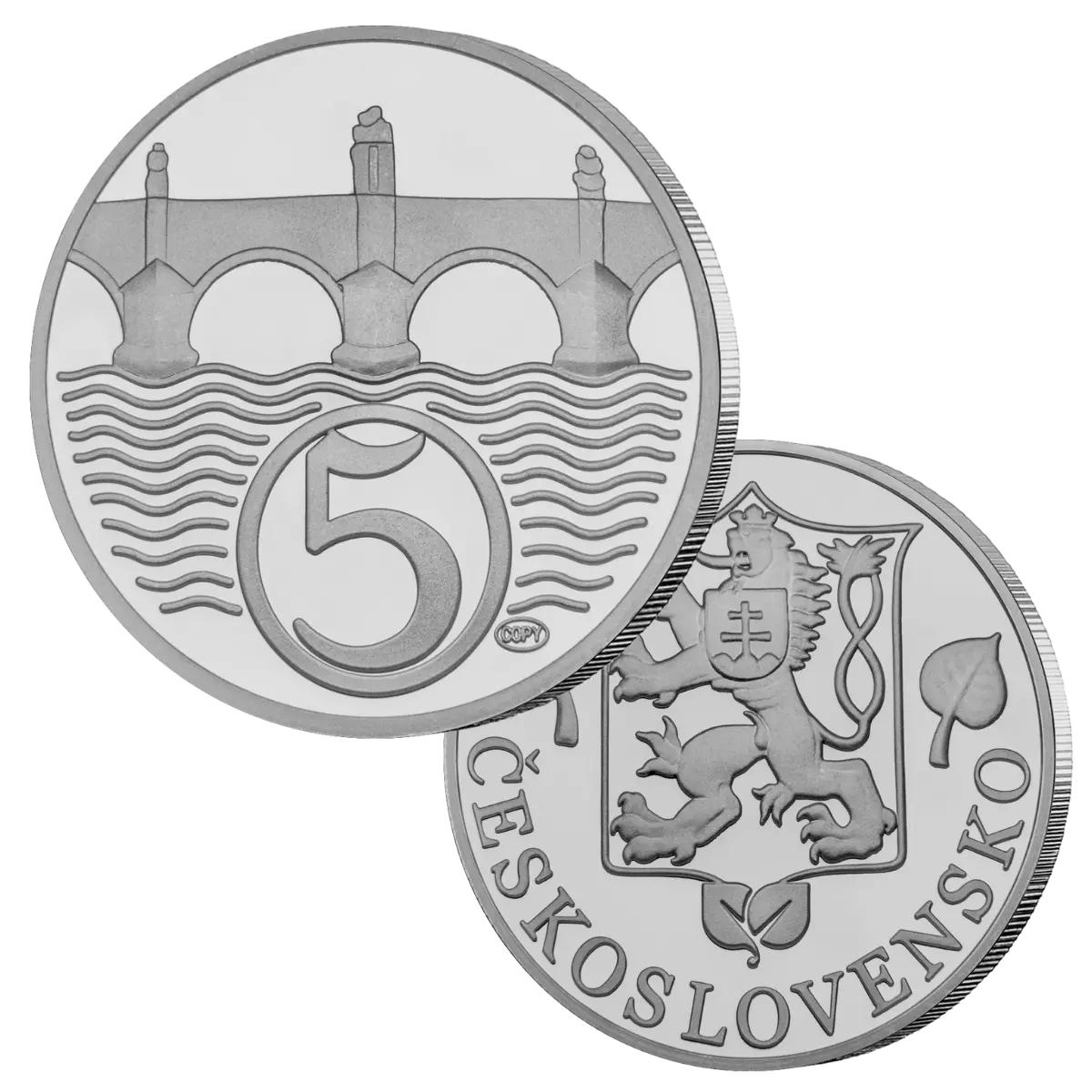 Averz pamětní ražby je věrným vyobrazením prvního československého pětihaléře. Jsou na něm znázorněny tři pilíře pražského Karlova mostu s vlnkami symbolizujícími Vltavu. Hodnotu původní mince vyjadřuje číslice 5 v kroužku. Reverzní strana je společná pro všechny pamětní ražby v kolekci. Český dvouocasý lev se slovenským znakem na hrudi je doplněn lipovými lístky a v dolní části obkroužen nápisem ČESKOSLOVENSKO.
