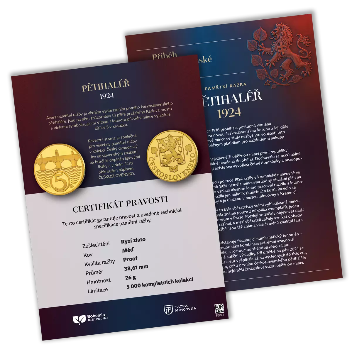 Pamětní ražba Pětihaléř 1924, zušlechtěná ryzím zlatem, je horkou novinkou české Bohemia mincovny a připomíná nejvzácnější oběžnou mincí první republiky. Mince nikdy nebyla oficiálně uvedena do oběhu. Dochovalo se maximálně několik desítek kusů. Při dražbě na jaře 2024 se cena z vyvolávacích 30 tisíc eur vyšplhala až na výsledných 66 tisíc eur, tedy asi 1,67 milionu korun, což z prvního československého pětihaléře učinilo v daném okamžiku nejdražší československou oběžnou minci.