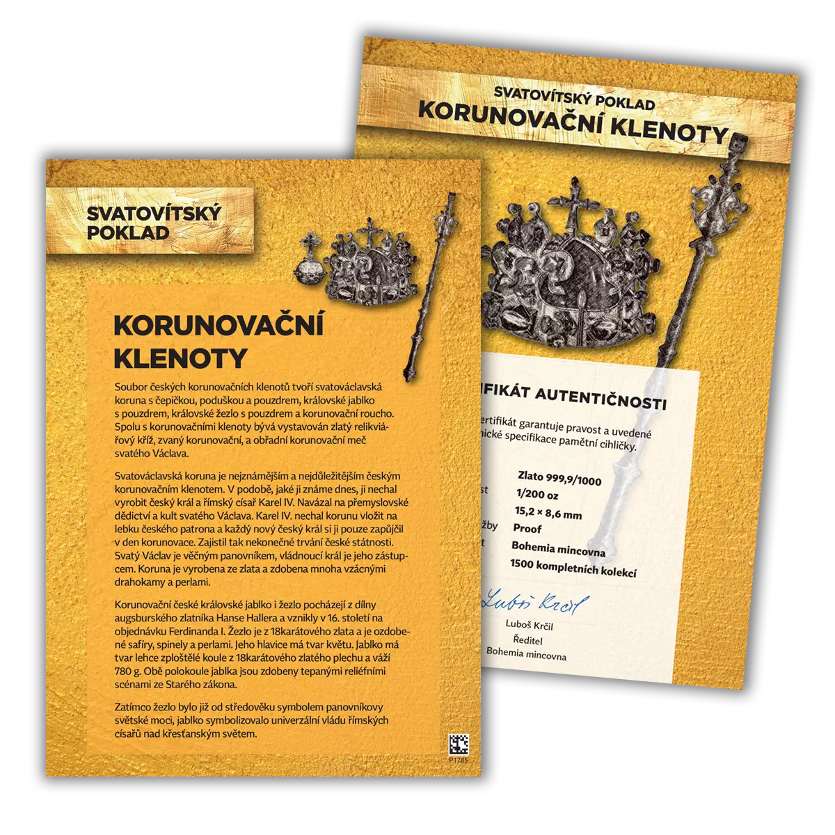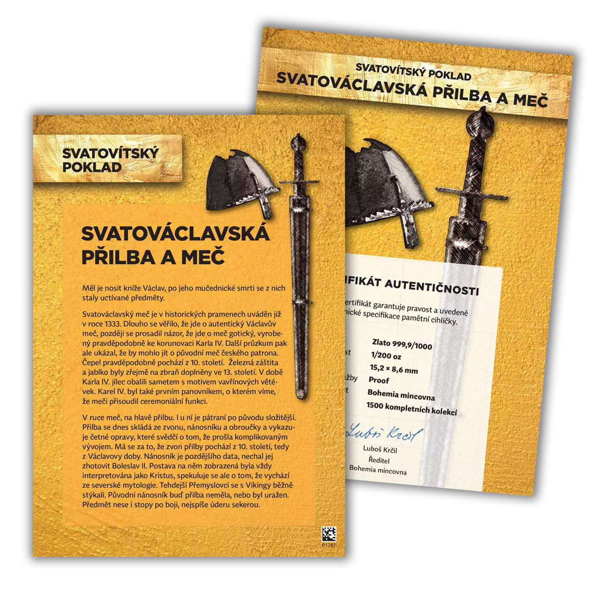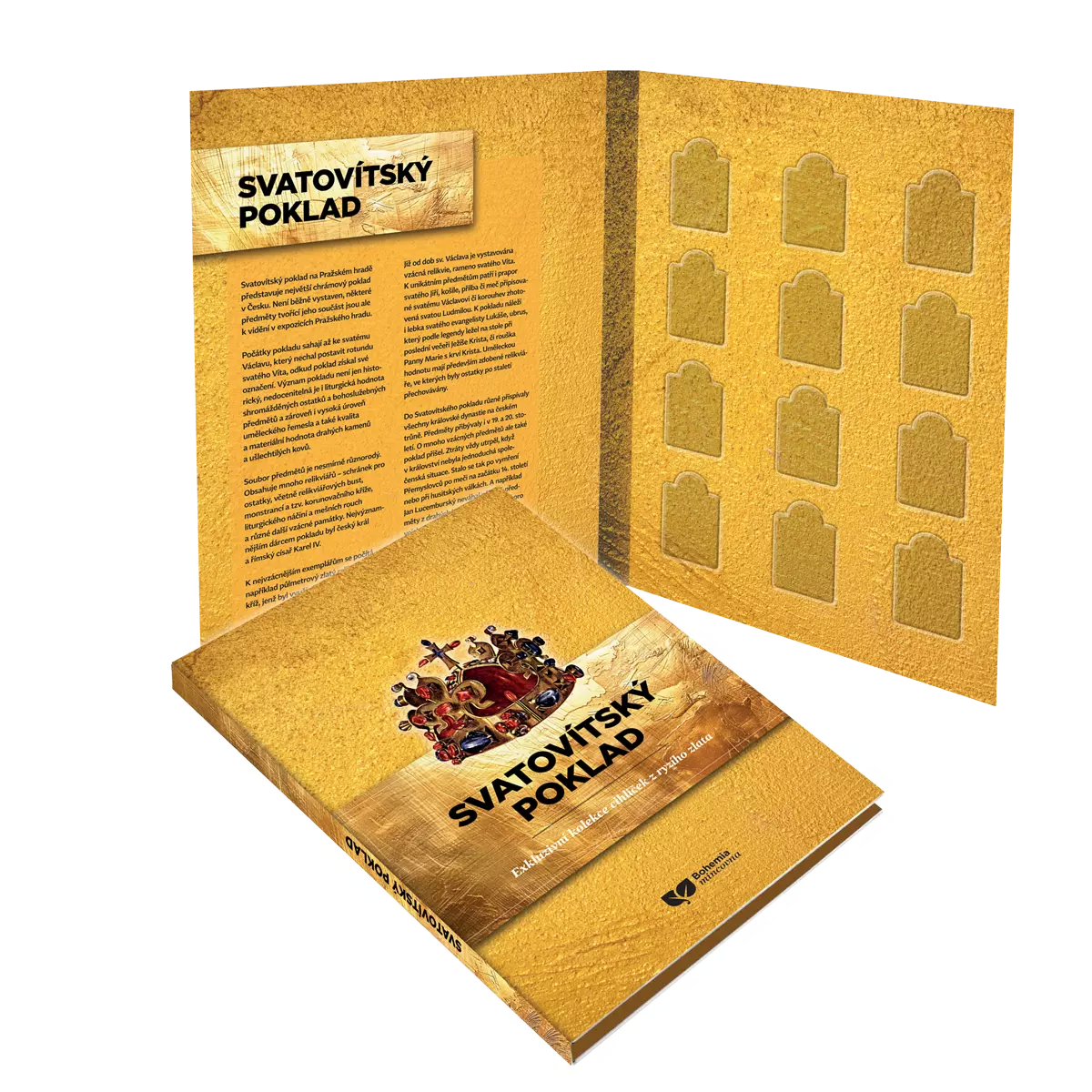Pamětní cihličky z ryzího zlata Korunovační klenoty a Svatováclavská přilba a meč otevírají exkluzivní kolekci Svatovítský poklad. Objednáním pamětních cihliček Korunovační klenoty a Svatováclavská přilba a meč si otevíráte fascinující kolekci Svatovítský poklad. Další pamětní cihličky z kolekce obdržíte cca v měsíčním intervalu každou za cenu 1 990 Kč + 129 Kč poštovné a balné. Kolekce nyní obsahuje 24 kusů zlatých cihliček, může se ale v budoucnu rozšiřovat. Více informací o kolekci najdete zde. Podmínky objednávky si můžete přečíst zde.