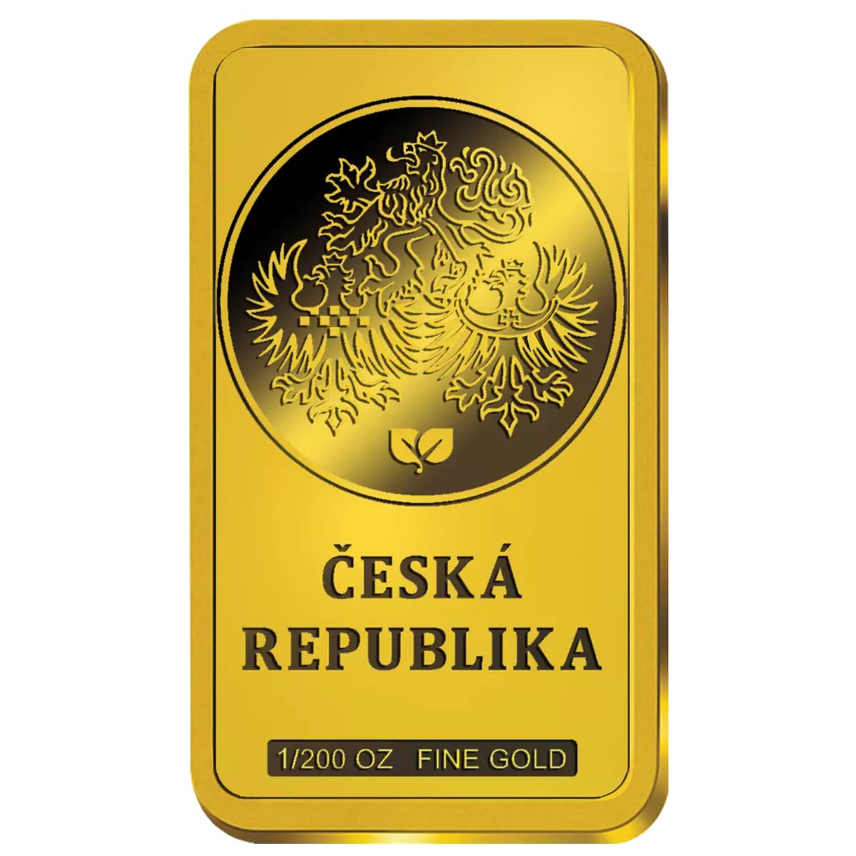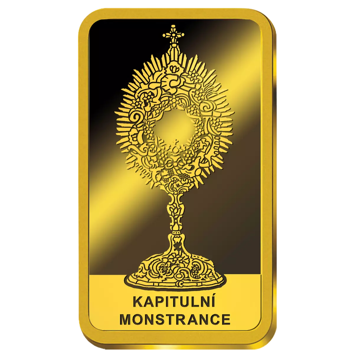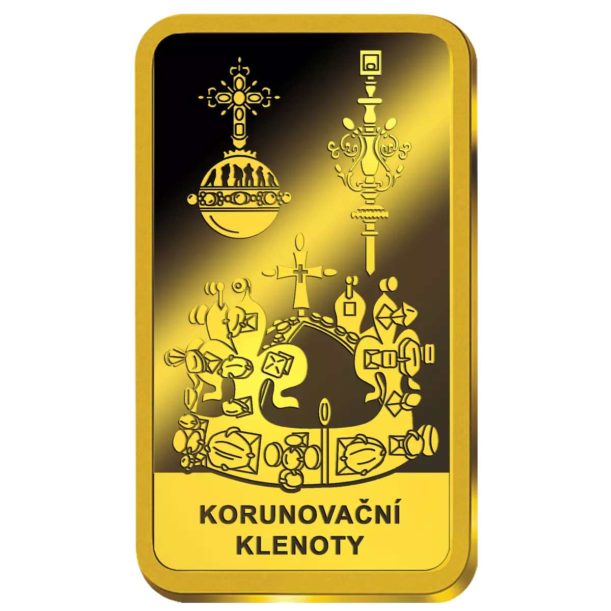 Přední strana této zlaté cihličky je zdobená jemným reliéfem korunovačních klenotů - svatováclavskou korunou, královským jablkem a žezlem.
