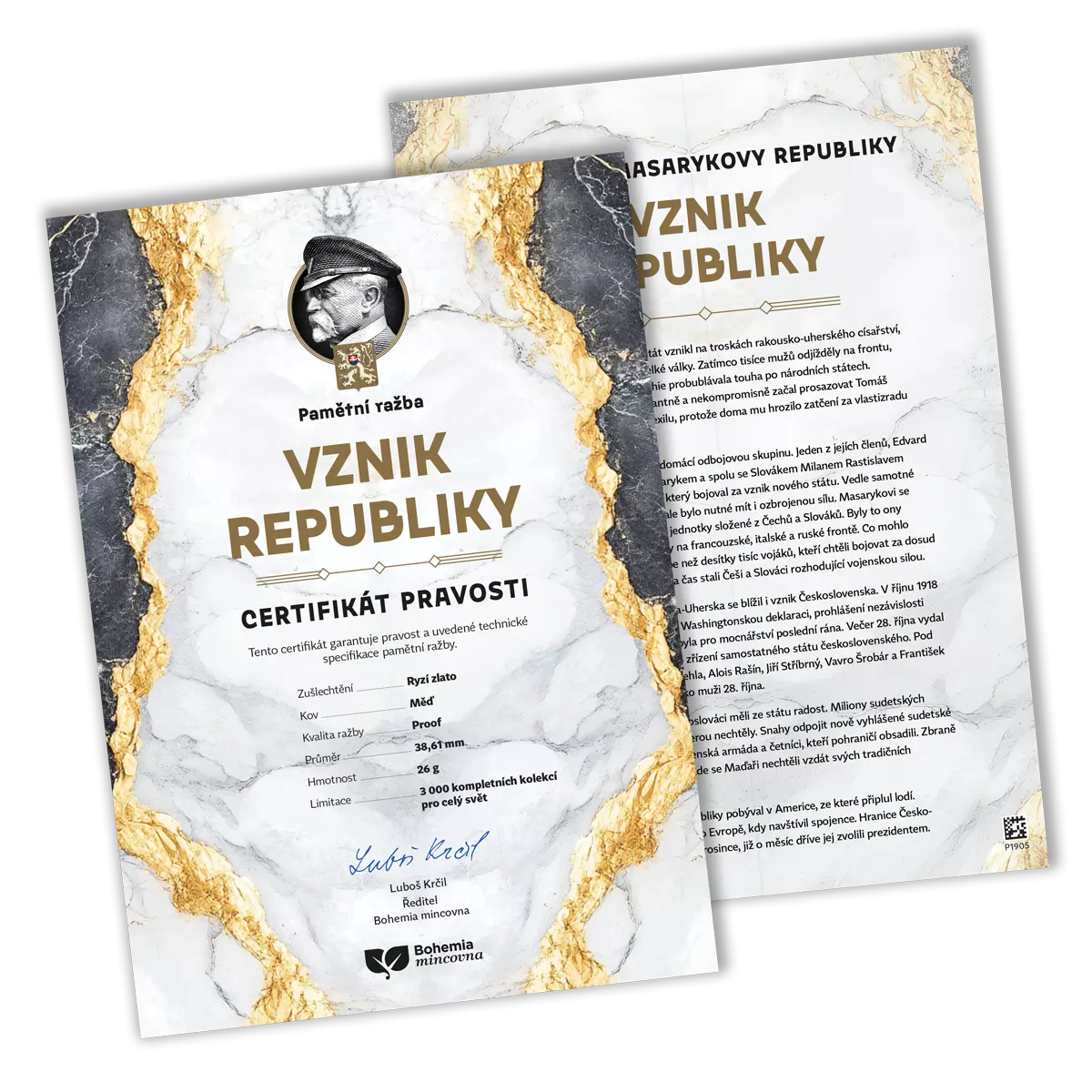 Pamětní ražba Vznik republiky je dodávána spolu s certifikátem autentičnosti zaručujícím pravost, původ a technické specifikace tohoto numismatu. Tato jedinečná ražba otevírá zcela novou kolekci s názvem Zlatá éra Masarykovy republiky.